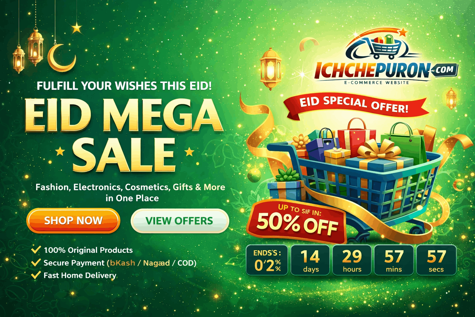 🌙 ঈদ স্পেশাল অফার! সারা বাংলাদেশে ফ্রি ডেলিভারি + ৫০% পর্যন্ত ছাড়! 🛍️
